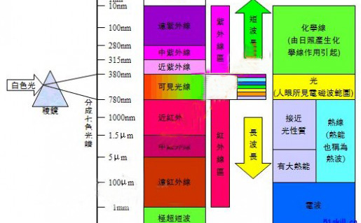 肉眼看得见的是电磁波中很短的一段,从0.4-0.76微米这部分称为可见光。可见光经三棱镜分光后,成为一条由红、橙、黄、绿、青、蓝、紫七种颜色组成的光带,这光带称为光谱。其中红光波长最长,紫光波长最短,其它各色光的波长则依次介于其间。波长长于红光的(>0.76微米)有红外线有无线电波;波长短于紫色光的(<0.4微米)有紫外线。